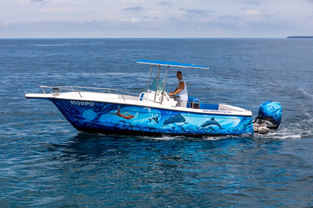 8.5 m long speed boat for daily family cruising. Tuna Tail 2 can receive 10 passengers + 1 crew member and achieve a speed of 35 NMh (19NMh – cruising speed).